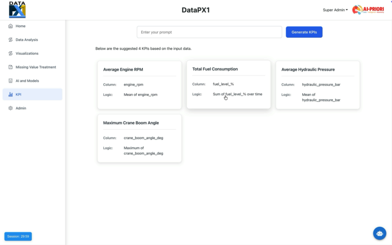 DataPX1, our artificial intelligence platform, gathers, organises, and analyses your disparate equipment or business data – then gives you an edge with AI automation. It combines the simplicity of an AI chatbot with the sophistication of enterprise business intelligence tools, but does the manual data processing for you so you can get straight to the results.